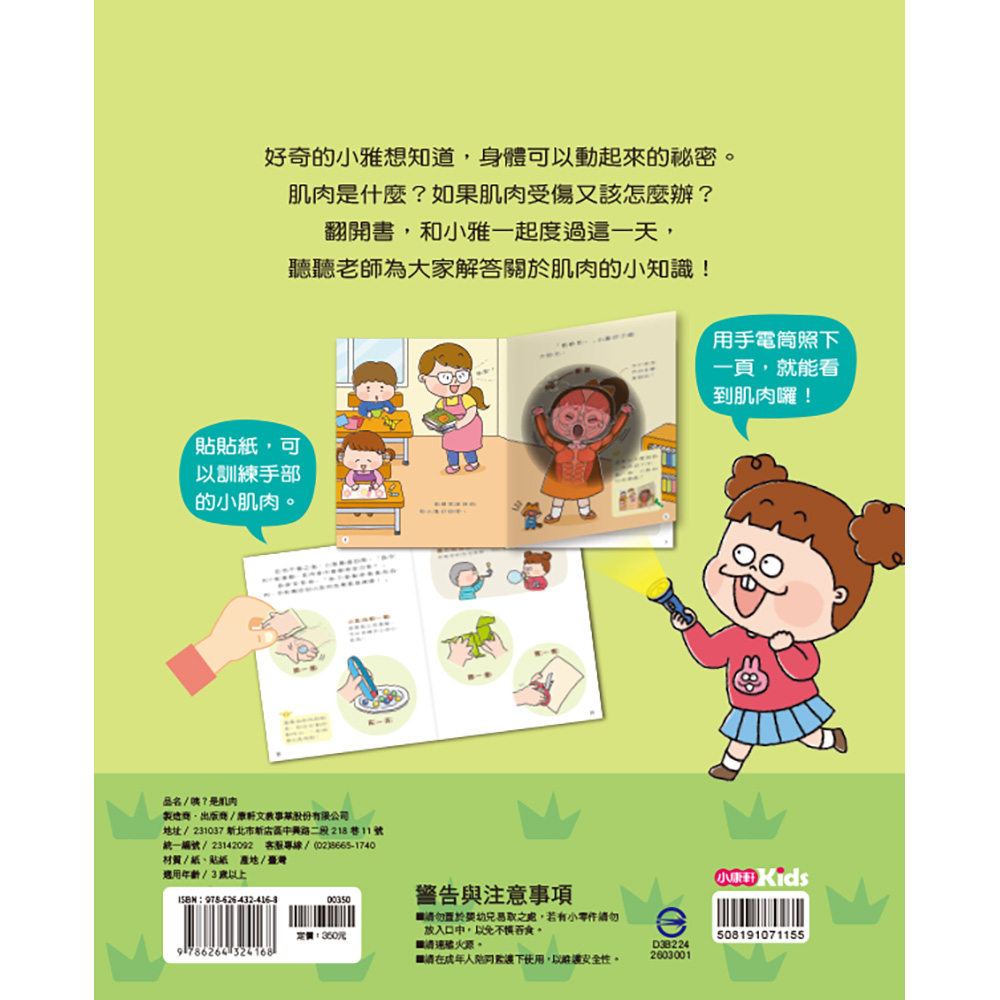本書透過生活化的故事情境,讓孩子知道身上的肌肉需要多多運用,並攝取幫助成長的營養,才能安心長大。