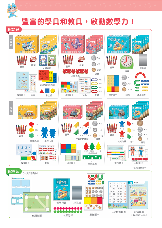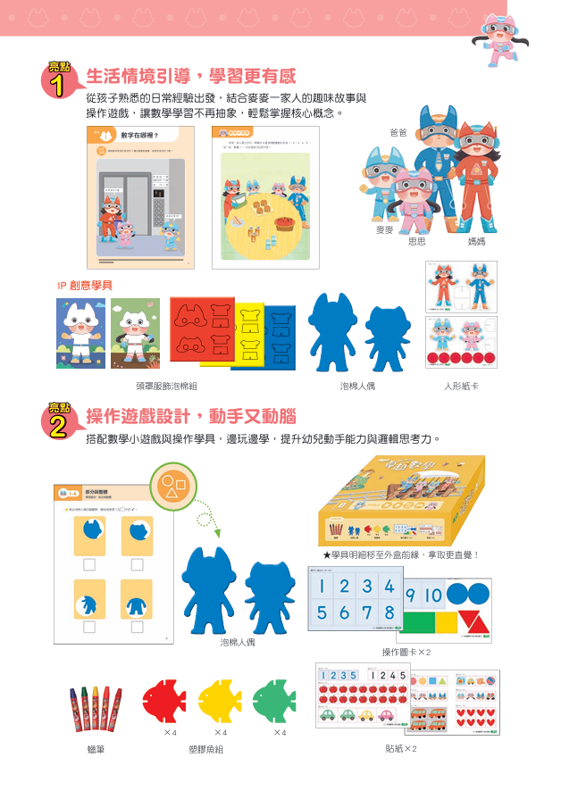 由麥麥一家人帶領幼兒從生活經驗出發,搭配完整學具結合遊戲操作與情境,輕鬆學會「數、量、圖形空間、邏輯」四大類別,為銜接小學奠定穩固基礎!