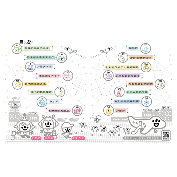透過主題式單元,認識世界節慶與特色活動的尋寶遊戲書。在可愛的圖案中,找出紅豆妮、綠豆兵、微笑先生與主題指定物件。