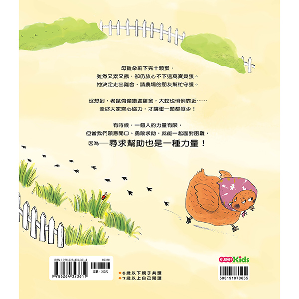 母雞朵莉下完十顆蛋,雖然又累又餓,卻仍放心不下這窩寶貝。她決定走出雞舍,請農場的朋友幫忙守護——沒想到,老鼠偷偷鑽進雞舍,大蛇也悄悄靠近……幸好大家齊心協力,才讓蛋一顆都沒少!